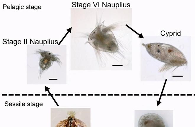 年轻时,藤壶是非常小的软体动物幼虫,没有壳。它们可以在海水中自由活动,但大部分时间都随海水漂流。经过大约2到3周的发育,它们变成了腺性枸杞子。
