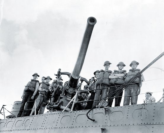 图10.“沃德”号驱逐舰的三号主炮及其炮手,这种四英寸/五十倍径的低仰角火炮是老式平甲板驱逐舰的典型主炮