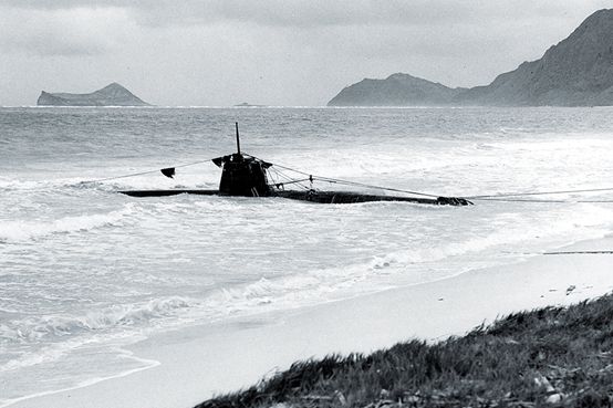 图9.和“沃德”号的猎物一样,这也是艘由两人操纵的日军“甲标的”微型潜艇。日军共派遣五艘该型潜艇试图潜入珍珠港发动突袭,照片中这艘搁浅在瓦胡岛东岸并被美军俘获