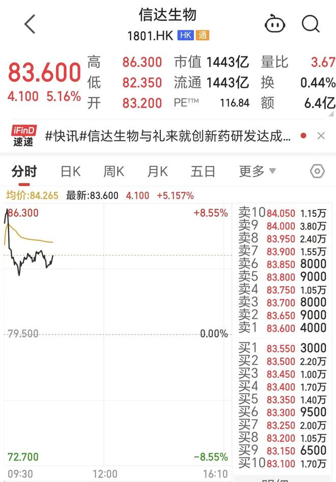 9日,信达生物高开一路拉升,最高涨8.55%报86.3港元/股,截至发稿时,股价小幅回落报83.6港元/股,涨幅5.16%,目前公司总市值1443亿港元。