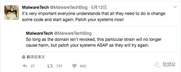 5月13号,发现了诡异域名注册即可中止病毒程序的安全工程师也坦白承认,这是个美丽的巧合,同时提醒需要为电脑打上补丁,以免病毒变种,绕过这一域名,发动下一波攻击。