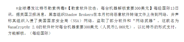 接下来的消息可能更值得我们注意,这场上周末掀起的“勒索病毒”风波仍在“肆虐”。不过,今天来自中央网信办的消息称,目前,该勒索软件虽然还在传播,但传播速度已经明显放缓。