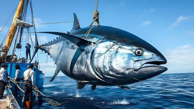 市面上常见的金枪鱼大多只有十来斤到几十斤,超过100斤的已属少见,而这两条鱼每条都重达400到500斤,相当于一个成年男性体重的三到四倍。