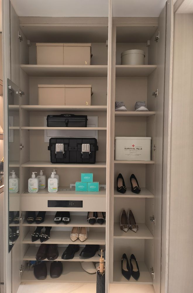 中建中环铂樾售楼处电话/地址:【预约☎】玄关收纳:定制橱柜,全部用环保等级E0板材打造,规划多个空间格子,方便各种鞋子、包包、靴子、随手物品轻松放置。
