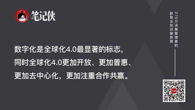 所以, 数字化是全球化4.0最显著的标志,同时全球化4.0更加开放、更加普惠、更加去中心化,更加注重合作共赢,世界将进入新全球化和“再全球化”的新阶段,旧的贸易秩序已经被打破,新的贸易秩序正在形成中。