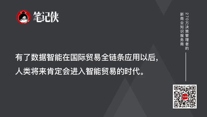 有了数据智能在国际贸易全链条应用以后,人类将来肯定会进入智能贸易的时代 。当然,虽不会像智能驾驶那样实现自动化,但可无限接近。