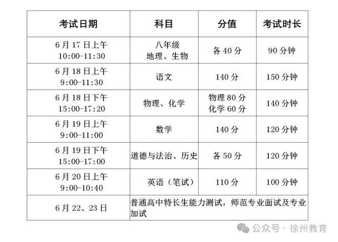 八年级地理生物考试时间安排在6月17日,中考文化考试安排在6月18日至20日,普通高中特长生能力测试、师范专业面试和专业加试安排在6月22日至23日,中考成绩预计将于7月3日公布,7月4日起各类学校分批次依序录取。