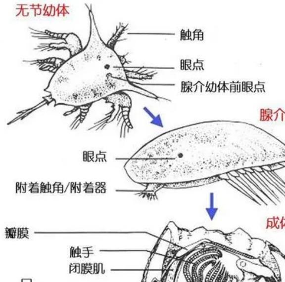 我们看到的大多数藤壶都是附着在其他生物身上的,所以我们会有藤壶不动的印象。其实藤壶在长成之前,幼体要经历三个阶段:浮游期、无节幼体和腺样体。