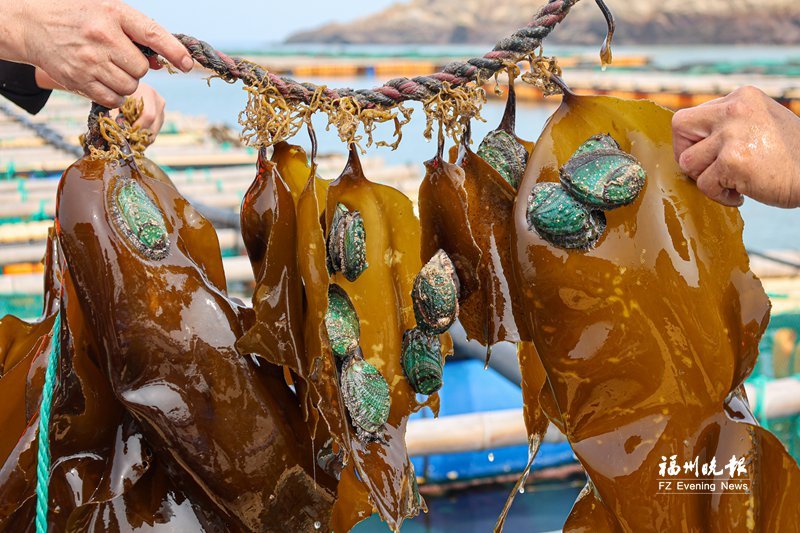 “与传统抽屉式鲍笼相比,开放式‘别墅型’鲍鱼网箱具有空间宽敞、水流通畅等优势,能够有效提升鲍鱼的成活率、生长速度和品质。”福州日兴水产食品有限公司董事长江铭福说,“我们将整根海带挂在网箱上方,让海带自然生长,既能持续净化水质、改善养殖环境,又能让鲍鱼自由摄食新鲜的海带叶片,实现生态养殖。”