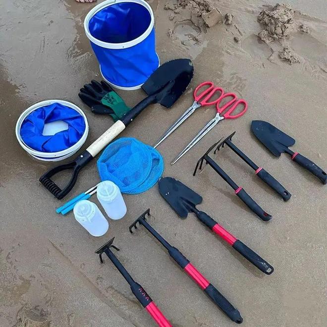基础工具:小铲子、耙子用来挖蛤蜊、沙虫;小桶用来装收获的 “战利品”;夹子可以防止抓螃蟹时被夹手;盐瓶是抓蛏子的神器,看到 “8” 字形小孔,撒点盐,蛏子就会自己蹦出来。