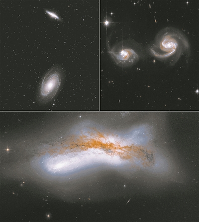 银河系与仙女星系未来3种可能的碰撞情景。左上:两星系擦肩而过。右上:两星系逐渐靠近并发生近距离接触。下图:两星系发生碰撞。图片来源:NASA/ESA
